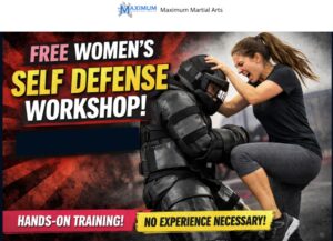 You must register online at this link: Maximum Martial Arts – FREE Women’s Self Defense Workshop